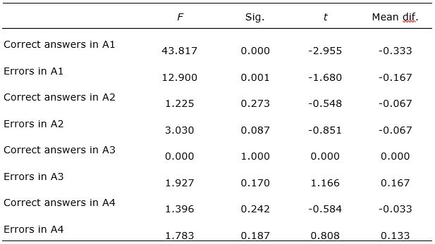 Finally, in the t-test for independent samples, the results give us average results above 2.5. This factor indicates that noun identification would be at the highest levels in both groups (excellent). The averages of the non-identification of nouns would oscillate in the middle levels. The same occurs in both groups. Analyzing the differences in the averages, we can observe that the difference is only significant in the A2 test, with a difference of -0.333 (Table 2). Here, a distance is established between the groups, favoring the experimental group over the control one. As for the rest of the texts (B2, C2, D2), the differences are not significant. It may be that there is no difference between the groups. Therefore, we are working with considerably homogenous groups concerning the number of nouns identified.
