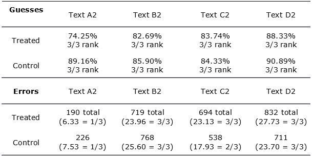 Regarding the results of the four tests, the nouns correctly identified in each text show us that higher percentages locate within the superior interval entitled “excellent” (see Table 1). There was also a more significant number of undetected nouns, and thus errors, the majority of both groups tend to be within the higher interval as well, except for the A2 test where they are indeed within the lowest interval. This fact reflects the lower degree of complexity and less number of words, and thus nouns, in the A text.