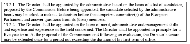 Notwithstanding the provision of the Common Approach (Table 6), under the Europol Regulation the MB maintains the power of adopting “internal rules regarding the procedure for the selection of the Executive Director, including rules on the composition of the selected committee which ensures independence and impartiality” (Article 11, sub-point (i) ).In this process the Commission has just one vote as well as all an ordinary Member State. The final choice is made by the Council on the shortlist proposed by the MB. Compared to the Convention, the Council Decision gave more margins for maneuvers to the Council by requiring “at least three candidates”. This limitation was removed by the Regulation and the removal can be read as an empowerment of the MB.