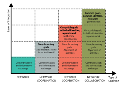 According to Cipolla (2004 cited in Manzini, 2008, p.71), when collaborative networks are discussed, it is assumed that the main point links all networks. It can also be observed that both the commitment and the investment of actors in this interconnected system will grow gradually, as the coalition increase (Figure 1).