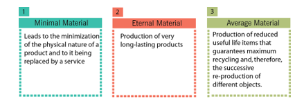 According to Nunes (2008), the term "culture of quality" is related to environmental protection issues, ways to design more efficient usage of resources, through programmed consumption and the reduction of waste. Within the ''culture of quality'', the use of new materials, in addition to meeting the needs of its use should be aimed at minimizing the disruption of the system. In keeping with Manzini (1993), Nunes (2008) presents three scenarios to make this possible: 1) the minimal material scenario, 2) the eternal material scenario, and 3) the average material scenario (Figure 2).