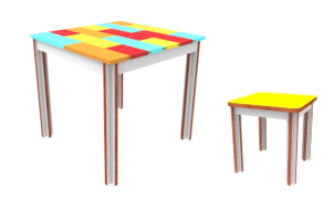 The Re-Tales table and stool follow the same standards. Both are intended to reuse mainly small parts. For the table, a mesh of residues was created for its top; due to its little surface, the stool used a whole piece. The feet two straight boards crossed that form a'+' figure that makes the piece sturdier. Locked systems below the top and between the legs increase support and balance. Since it is child-friendly furniture, the existing coating on the remains of the MDF was kept to make the furniture playful and colorful (Figure 6).
