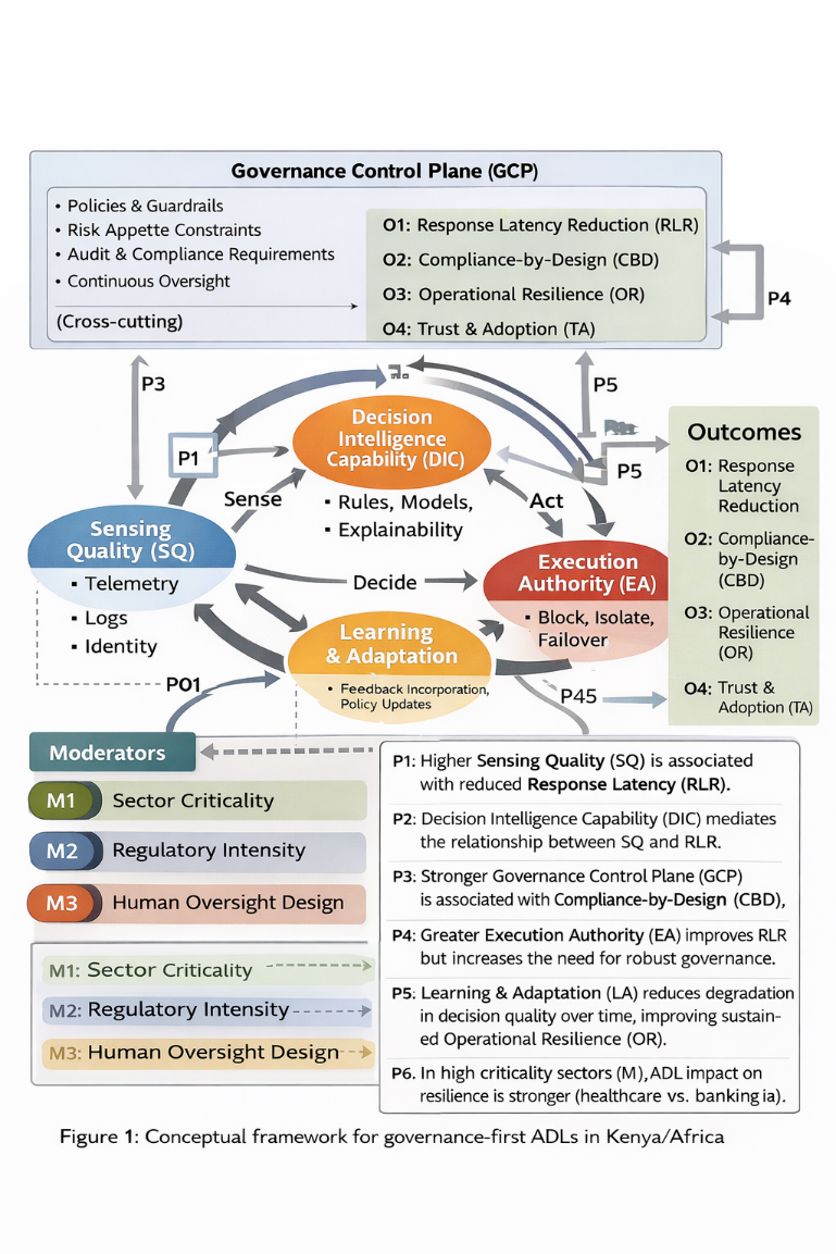 Abstract: African organizations are operating in increasingly complex and high-velocity digital environments characterized by mobile-first service delivery, persistent cyber threats, skills shortages, and rising regulatory expectations. Traditional human-centered decision-making models struggle to respond effectively at machine speed, particularly in critical sectors such as cybersecurity, banking, and healthcare. This paper proposes a governance-first conceptual framework for Autonomous Decision Loops (ADLs)—closed-loop systems that sense, decide, act, learn, and operate under continuous oversight. Grounded in decision-cycle theory, decision intelligence, high-reliability organizing, and contemporary AI governance standards, the framework explains how ADLs can reduce response latency, embed compliance, and enhance operational resilience in Kenya and across Africa. The study develops testable propositions and discusses implications for managers, regulators, and policymakers seeking to balance autonomy with accountability in high-risk digital ecosystems.