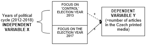 To answer this question two variables were identified and determined: the independent is the timeline of the political cycle in the Czech Republic; in the studied period (see chapter 3.6) the elections were held in 2013 and 2017. In accordance with the theory of political cycle (see for example Dubois 2016; Martínez 2009) the presentation of this popular topic (as a dependent variable) in the Czech media should be intensified in the time period around the Election Day 2017. The Figure 1 depicts variables and it shows the model, on which is based the quantitative analysis. The independent variable (the year of a political cycle in the Czech Republic) influences the single dependent variable - a perception of the importance of the studied topic expressed by its reflection in the Czech printed media. The following hypothetical statement is tested: the number of published articles tends to be higher around the election year 2017; the correlation between the election year 2017 and the number of published articles is supposedly positive: it is expected the highest number of published articles in 2017. This positive correlation is depicted by the symbol ´+´ in the diagram. Since an ´affair´ of double quality of food in the European Parliament dates back to 2011 (Sehnalová 2017), a ´control´ election year 2013 (plus one year more, 2012, of the previous political cycle) was included in the study.