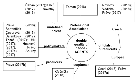 The next complementary (qualitative) exploration of the media articles (see 3.6) in the period from October, 2017 to present made possible to identify 5 principle agents connected with the issue of double quality of food (see Figure 2). This qualitative analysis categorized five principal actors (or agents) engaged in the issue: 1) Professional Associations: i.e. The Association of Consumers – in the Czech Republic or in the Slovak Republic; institutions, academic centers or organizations that have conducted the surveys on the quality of food or they are somehow involved in the activities of food industry such as ´Potravinářská komora ČR´) fit this category as well; 2) policymakers: this category involves the local, regional, national (ministers, presidents), cross-national politicians (for instance, the Czech deputy in the European Parliament Olga Sehnalová or Věra Jourová from the Czech Republic, the European Commissioner for Justice, Consumers and Gender Equality); 3) producers or distributers of food products such as the cross-national supermarket chains Billa, Lidl, Tesco and so on; 4) consumers or citizens; 5) officials, bureaucrats: for example the representatives of the European Commission or employees of the Czech Ministry of Agriculture.