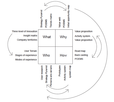 Professor Michael Porter of Harvard creates the activity system framework. It can be used to show how a company’s strategic position is contained in a set of tailored activities designed to deliver it by showing the critical activities needed to bring innovation to life and the interdependencies among them. It also can be useful for examining and strengthening the strategic fit. In companies with a clear strategic position, several higher-order strategic themes can be identified and implemented through clusters of tightly linked activities. (Porter, M. E, 1996) Taking these interdependencies into account while the project is still at an early phase allows companies to ascertain where an important activity lacks a necessary prerequisite activity. Without this early view, it is likely that companies will not discover missing capabilities until after the innovation is launched. (Whitney, P, 2015)