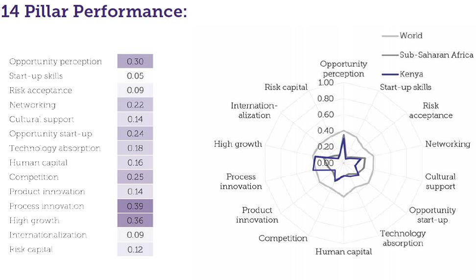The Kenyan Government should work towards strengthening the entrepreneurship ecosystem of incubator businesses within the economic zones. According to the Global Entrepreneurship and Development Institute (GEDI) Global Entrepreneurship Index, 2017, Kenya’s strongest area is in process innovation while its weakest area is in start-up skills (GEDI, 2017). In terms of entrepreneurship ecosystem management support to entrepreneurs, Kenya ranks 107 out of 137 countries globally and 11 out of 30 countries in sub-Saharan Africa (GEDI, 2017). The index below for Kenya illustrates weaknesses in a wide range of performance areas that unfortunately are not being adequately addressed at both National and County Government levels. This means addressing issues to do with opportunity perception, acceptance of risk, ability to network, creation of an enabling cultural environment, spotting of potential startup opportunities, capability for technological absorption, human capital skill set development, need to be competitive, ability to embrace product/ process innovation, ensuring accelerated growth, and ability to deal with capital risks (GEDI, 2017).