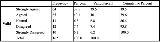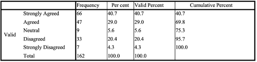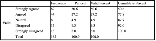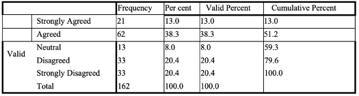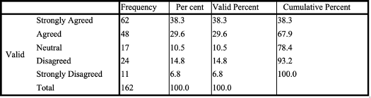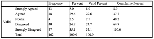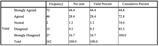 The Table 4.16 shows that 82 (or 50.6%) respondents “Strongly Agreed” with the statement, 44 (or 27.2%) respondents “Agreed” with statement, 8 (or 4.9%) respondents are “Neutral”, 15 (or 9.3%) respondents "Disagreed" with the statement and 13 (or 8.0%) respondents "Strongly Disagreed" with the statement.
