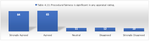 Table 4.11shows that 64 (or 39.5%) respondents “Strongly Agreed” with the statement, 65 (or 40.1%) respondents "Agreed" with statement, 11 (or 6.8%) respondents are "Neutral", 12 (or 7.4%) respondents "Disagreed" with the statement and 10 (or 6.2%) respondents "Strongly Disagreed" with the statement. This distribution shows that the majority of the respondents merely agreed that procedural fairness is significant in any appraisal rating.