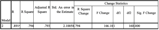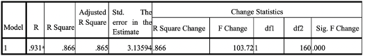 The F-Change is 166.10. This value is significant because the significance level is =.000 which is less than 5%. This result implies that overall; the regression model is statistically significant, valid and fit. This suggests implicitly that the independent variable explains that there is a positive and significant relationship between dependent and independent variables.