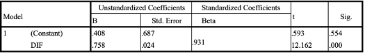 The model summary results above show that the relationship between distributive fairness and employees’ productivity, as revealed by the regression coefficient (R) result is .931 (93.1%); implying that a strong relationship exists. Also, as indicated by the table, the variation in the dependent variable as a result of the predicting variable, as indicated by the R-Square value, is .866 (86.6%). This implies that about 86.6% of variations in employee productivity (EMP) are explained by the Distributive Fairness (DIF) with the remaining 13.4% being accounted for by other factors not included in the model. The F-Change is 103.72. This value is significant because the significance level is =.000 which is less than 5%. This result implies that overall; the regression model is statistically significant, valid and fit. This suggests implicitly that the independent variable explains that there is a positive and significant relationship between the dependent (EMP) and independent variable (DIF).