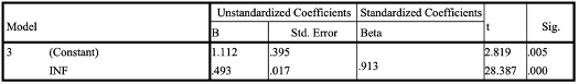 The model summary results above show that the relationship between the predictors and dependent variables, depicted by the regression coefficient (R) value is .913 (91.3%). This means that there is a strong relationship between the two variables. Also, as indicated by the table, the variation in the dependent variable as a result of the predicting variable, as indicated by the R-Square value, is .834 (83.4%). This implies that about 83.4% of variations in employees’ effectiveness and efficiency (EFF) are explained by the Interactional fairness (INF) with the remaining 16.6% being accounted for by other factors not included in the model.