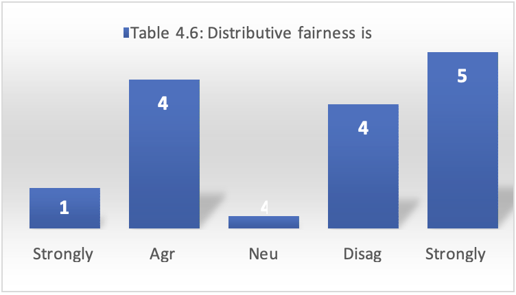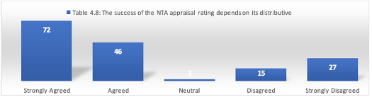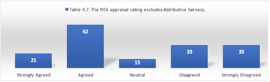 Table 4.7 shows that 21 (or 13.0%) respondents “Strongly Agreed” with the statement, 62 (or 38.3%) respondents "Agreed" with statement, 13 (or 8.0%) respondents are "Neutral", 33 (or 20.4%) respondents "Disagreed" with the statement and 33 (or 20.4%) respondents "Strongly Disagreed" with the statement. This distribution shows that the majority of the respondents merely agreed that the NTA appraisal rating excludes distributive fairness.