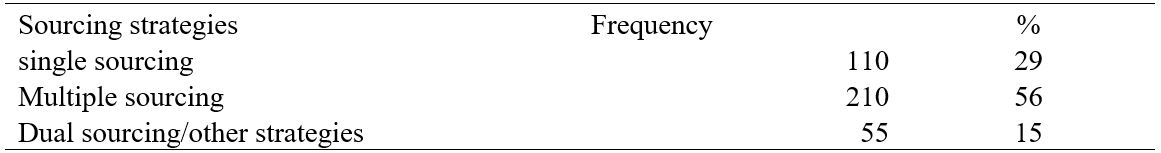 The following section contains the findings of strategic sourcing and firms’ performance in the descriptive and inferential statistics form. The researcher asked the respondents to indicate the sourcing strategies their firms’ have been using in the past five years up to 2017 to acquire goods and services. The findings in Table 4.1 indicated that majority of energy generating firms (56%) have been adopting multiple strategies for sourcing materials, 29 per cent of the respondents indicated that their energy generating firms have been using single-sourcing strategies and 15 per cent of the respondents pointed out that they have been using dual sourcing strategies in sourcing materials for their firms.