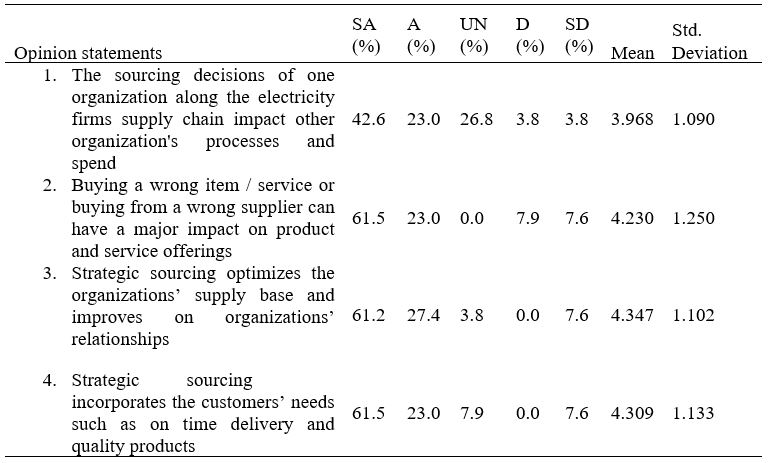 The results also revealed that strategic sourcing optimises the organisations’ supply base and improves on organisations’ relationships. Likewise, the researchers found that sourcing decision of one organisation along the energy generating firms supply chain impact other organisation's processes and spending. Equally, firms should incorporate correct specifications of the customers’ needs, such as on-time delivery and quality products when sourcing. However, the study disclosed that buying a wrong item or service or buying from a wrong supplier can have key impact on product and service offerings by energy generating firms. These findings concurred with the study by Duffie and Koester (2005).