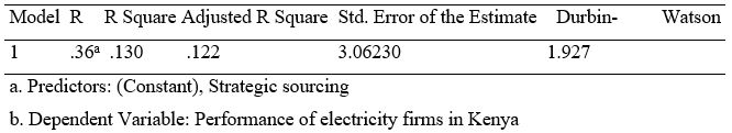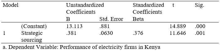 An additional test was conducted on simple regression to determine the influence of strategic sourcing on the performance of energy generating firms in Kenya. The model used was Y= ß0+ ß1x1+ ε. Where: Y= Performance of energy generating sector supply chain β0=constant (Slope) of the Model β1 is the coefficient for X1; X1= Strategic sourcing practice; ε = error term
