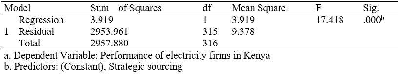 The R2 for the regression model between strategic sourcing and the performance of energy generating firms in Kenya was 0.122 meaning that strategic sourcing explains 12.2% variation in the performance of energy generating firms in Kenya. In contrast, the error term expresses the remaining variation.The regression model was a good fit, as indicated by a significant F-statistic (F=17.418, p<0.05). See Table 4.4.