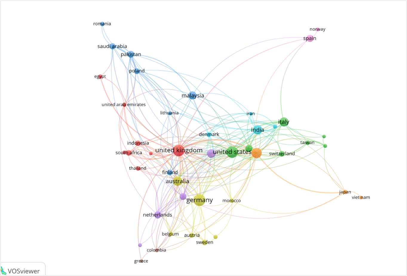 Asian countries such as India, China, Malaysia, and South Korea are visibly active in research collaborations and partnerships with Western and regional peers. India, in particular, demonstrates significant connectivity with the United Kingdom, the United States, and Germany, reflecting its growing research capacity and integration in global academic networks. Emerging contributions from African countries such as South Africa, Morocco, and Egypt are also evident, marking a gradual but important step towards more inclusive research participation. South Africa shows collaborations with the United Kingdom and Germany, suggesting that African scholars are entering into influential research dialogues within the sustainability leadership domain. The visual density of the network, with overlapping clusters and interwoven linkages, reflects a high degree of interdisciplinarity and cross-national engagement in the field. These patterns highlight the critical importance of global collaboration for advancing theoretical and empirical insights on sustainable leadership and performance. For underrepresented regions, particularly in Africa and Latin America, the network signals the potential for increased involvement through strategic partnerships, knowledge sharing, and capacity development initiatives.