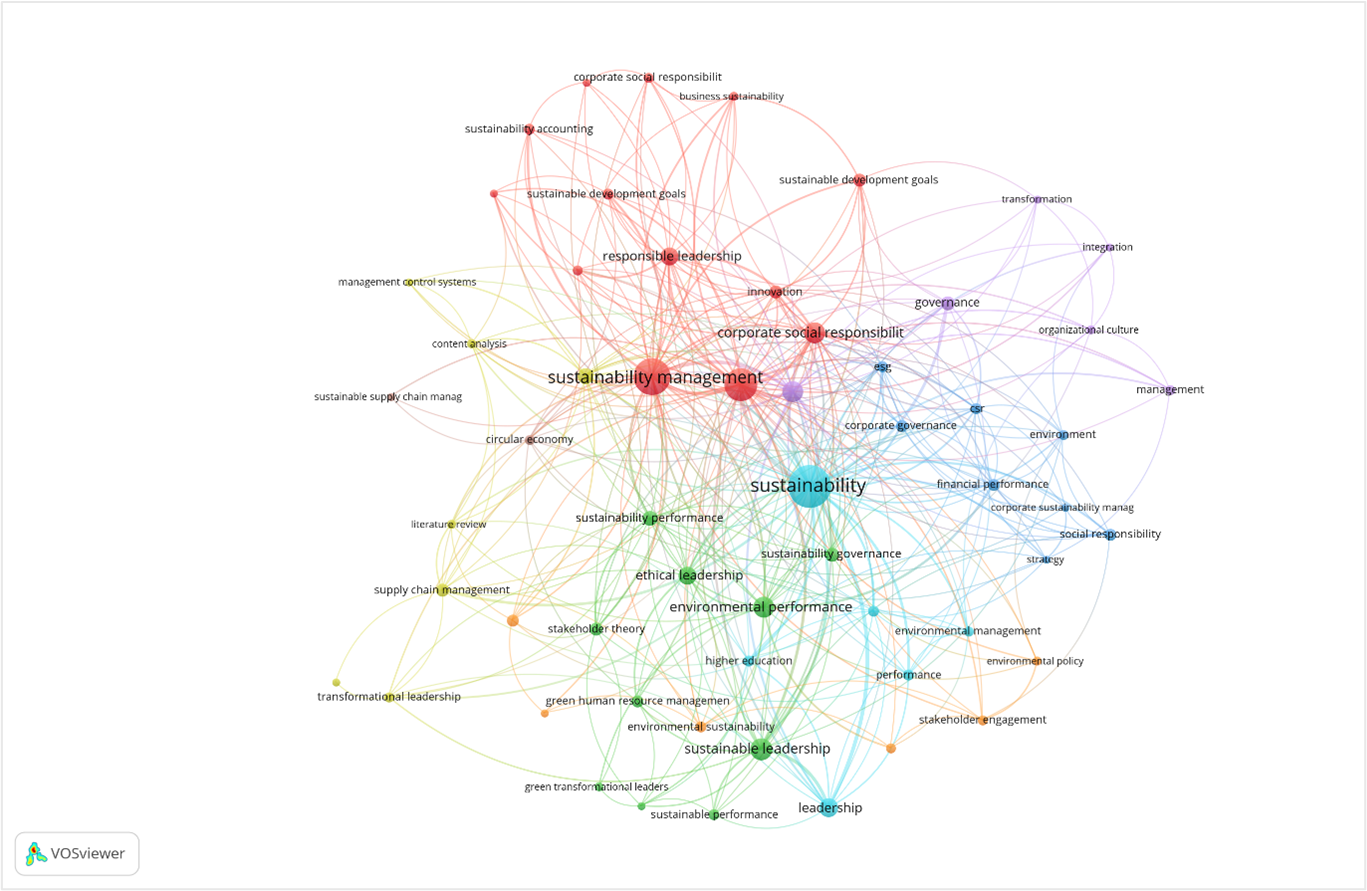 Meanwhile, the blue cluster appears more organization-centric, connecting terms such as corporate sustainability management, financial performance, organizational culture, and strategic management. These terms show how leadership and sustainability are positioned within broader corporate performance and governance contexts. The purple cluster links keywords like integration, transformation, governance, and organizational culture, reflecting sustainability initiatives' organizational change and implementation aspects. This suggests increasing interest in embedding sustainability into corporate structures and practices.