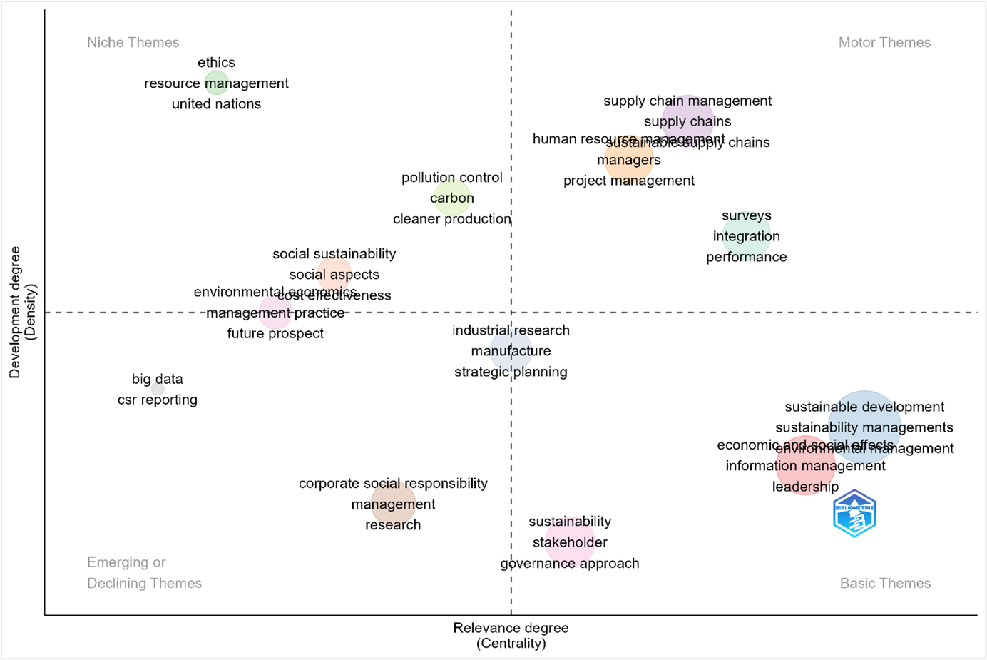 Interestingly, the terms carbon, pollution control, and cleaner production are positioned at the intersection between niche and motor themes, suggesting rising interest in environmental efficiency but with still-limited integration across broader management contexts. Overall, the thematic map reveals a field in intellectual transition. Operational and managerial constructs such as supply chain management and HRM are solidified as research anchors. At the same time, foundational themes like leadership and sustainability are recognized as vital but need further depth. Meanwhile, legacy terms like CSR may evolve into broader constructs or give way to more systemic approaches to sustainability performance. This dynamic illustrates the importance of aligning leadership models with operational mechanisms and societal outcomes to enhance sustainable performance across organizations.